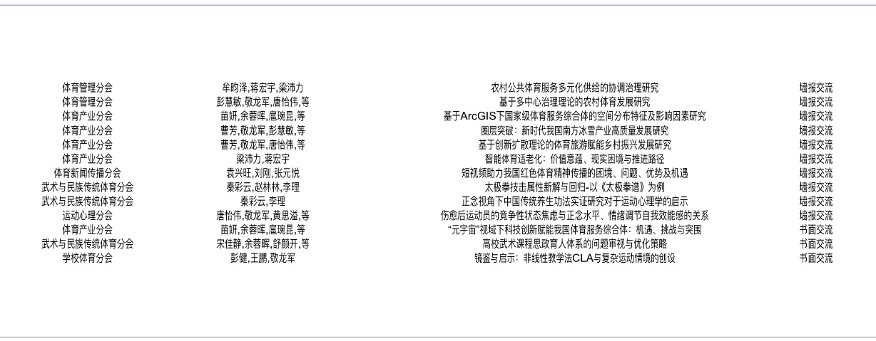 华体会官方网页版在本届大会中被录用论文25篇,其中专题报告7篇、墙报交流14篇、书面交流4篇。学院研究生吴若山、熊薇、彭慧敏、施文博、谭凯戈,分别在运动心理分会、体育管理分会、体育统计分会、学校体育分会作《正念对伤愈期运动员强制运动行为的影响:自我批评和竞争状态焦虑的中介作用》《县域公共体育服务发展困境与纾解路径—基于“新木桶理论”视域》《基于SWOT-PEST模型的农村公共体育服务发展研究》《体育赛事志愿者动机量表的编制及信效度检验》《体教融合视域下霹雳舞进校园的价值与路径》专题报告。