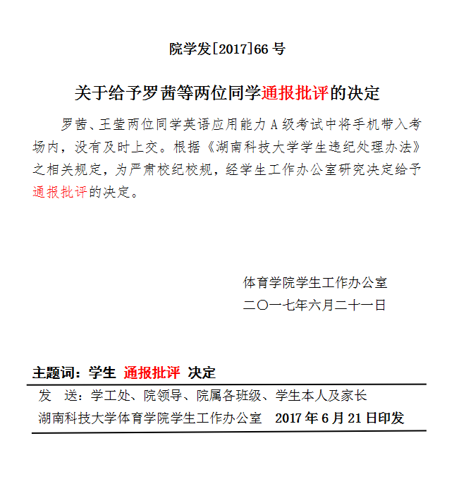 关于给予罗茜等两位同学通报批评的决定