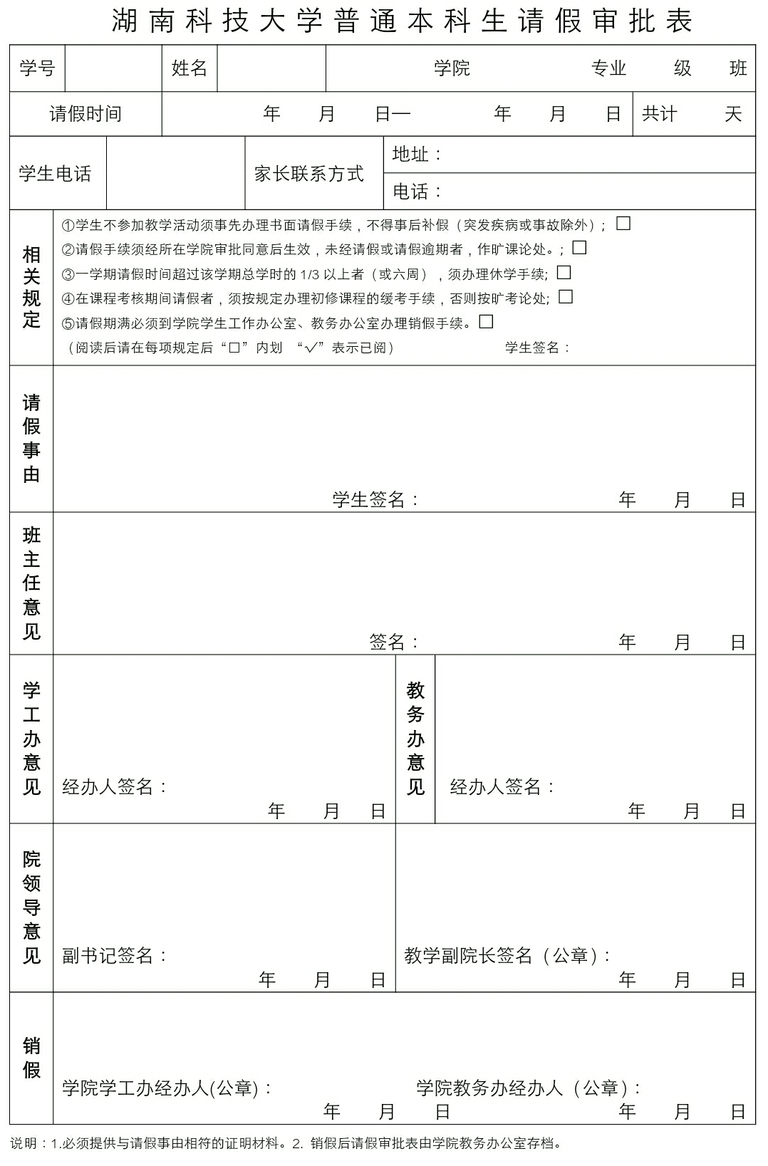 您所在的位置: 首页» 学生工作» 日常管理 湖南科技大学普通本科生请假审批表 时间:2017-10-06 00:00:00 作者:华体会(中国)团委办公室 相关附件: 湖南科技大学普通本科生请假审批表.doc