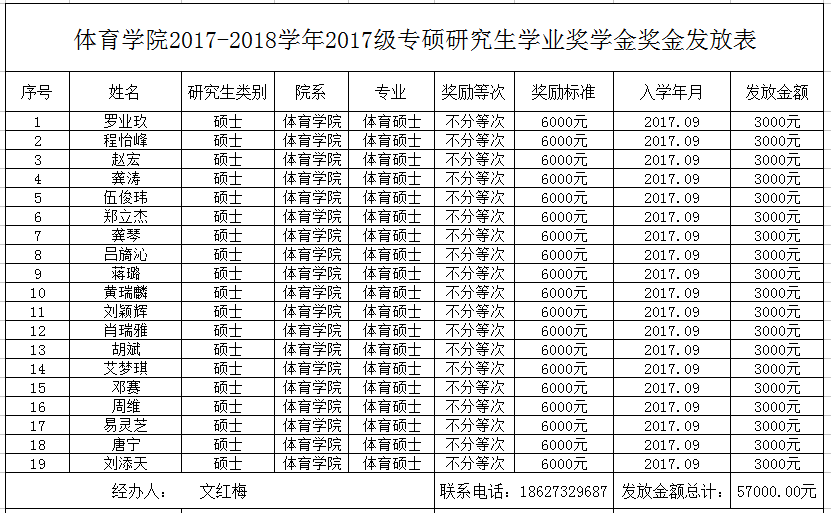 华体会(中国)2017-2018学年2017级专硕研究生学业奖学金奖金发放表