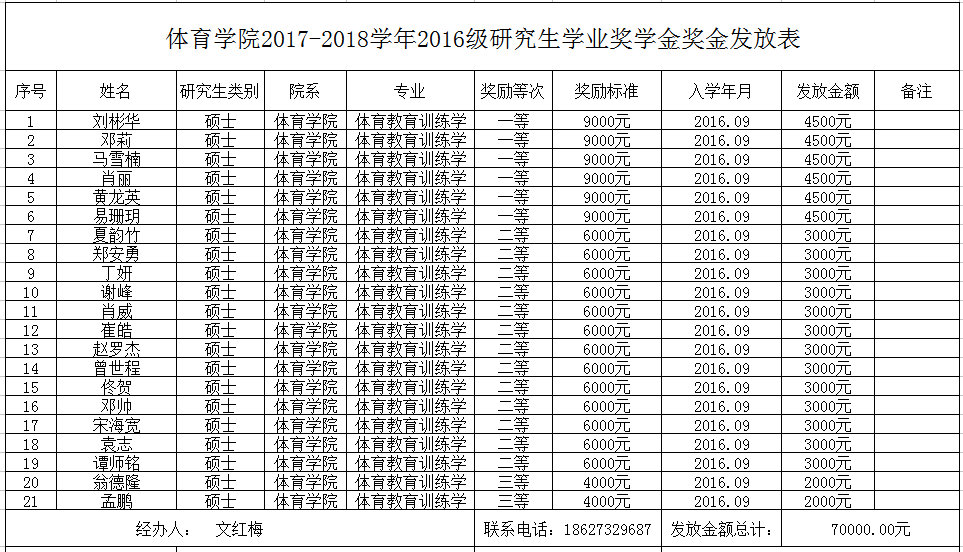 华体会(中国)2017-2018学年2016级研究生学业奖学金奖金发放表