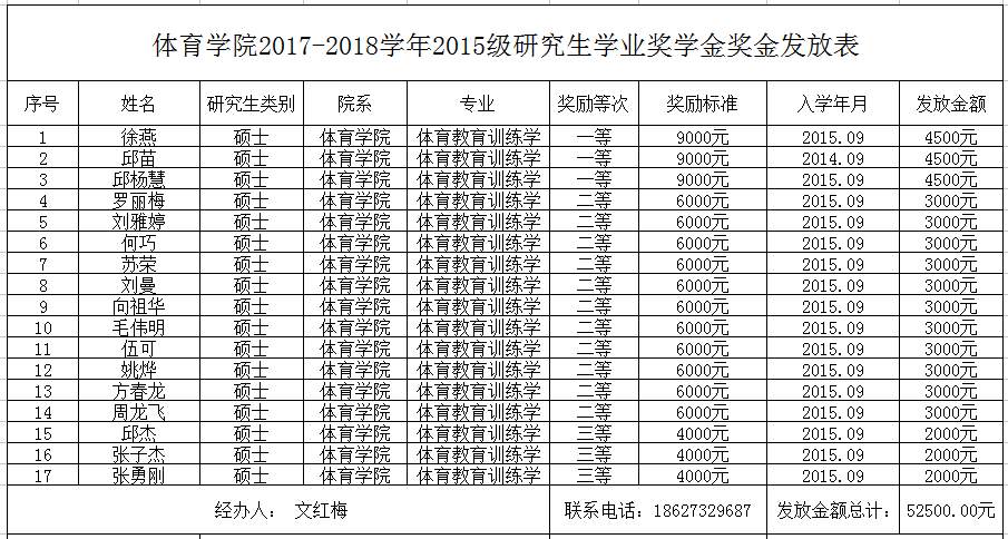 华体会(中国)2017-2018学年2015级研究生学业奖学金奖金发放表